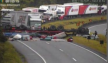 Tombamento de carreta com produto perigoso bloqueia sentido Curitiba da BR-116